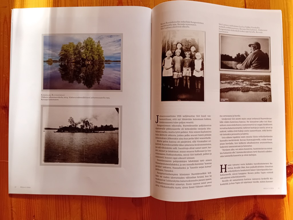 Kangasniemen edustalla, Ruovedenselän pohjoisosissa sijaitsevalle pikkusaarelle oli kirkonkylän rannasta lyhykäinen matka, mutta tyttö pelkäsi. Niin veneen kaatumista kuin äkillistä ukkosta, joiden pelko seurasi häntä pitkään juhannuksen jälkeenkin aina kun perhe lähti veneretkelle.