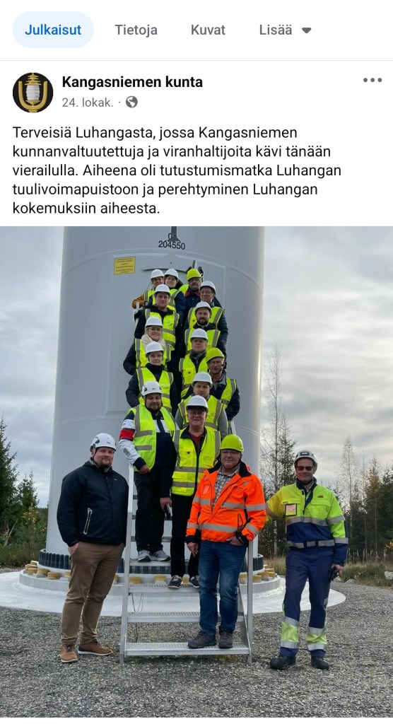 ”Luhangassa keskusteltiin laajasti voimaloiden vaikutuksista, rakentamisen taustalla olevista prosesseista ja nykytilanteesta. Keskustelujen teemat olivat pitkälti samankaltaisia, mistä olemme puhuneet lukuisissa tuulivoimatilaisuuksissa Kangasniemellä. Samalla osallistujat saivat kokemuksellista tietoa, kun vierailimme toiminnassa olevassa tuulivoimapuistossa. Jokainen osallistuja varmasti pohti vierailun jälkeen itsenäisesti sitä, missä määrin matka lisäsi ymmärrystä tuulivoiman hyödyistä ja haitoista.”